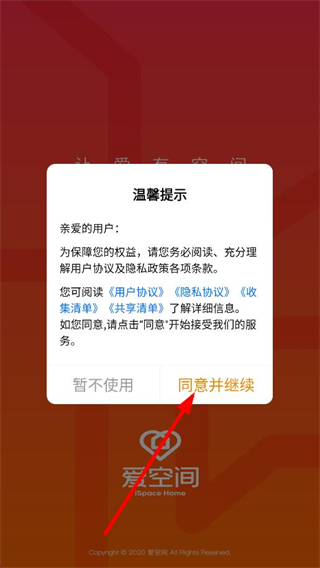 1、在温馨提示弹窗中,点击同意并继续,进入首页。