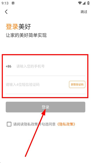 4、在登录页面,输入手机号,获取验证码,点击登录,完成账号登录。