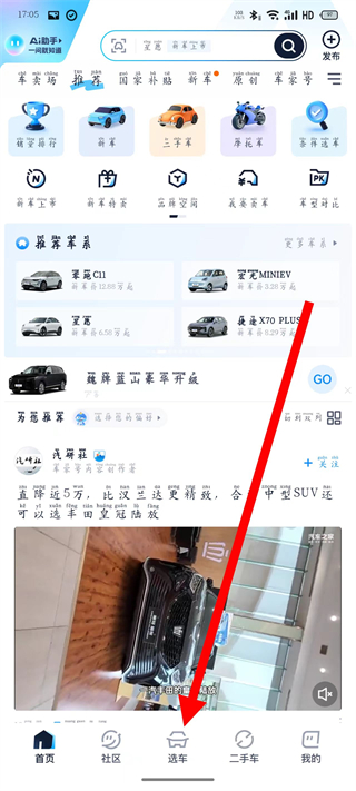 1、打开汽车之家,点击底部导航栏的选车,进入选车页面。
