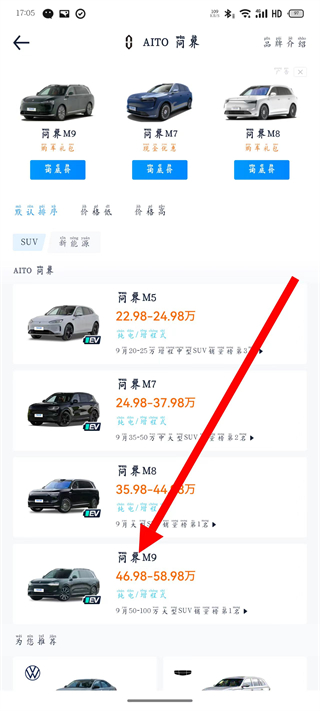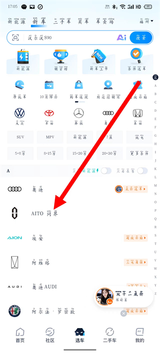 2、在选车页面中,找到并点击问界品牌,进入问界车型列表页。
