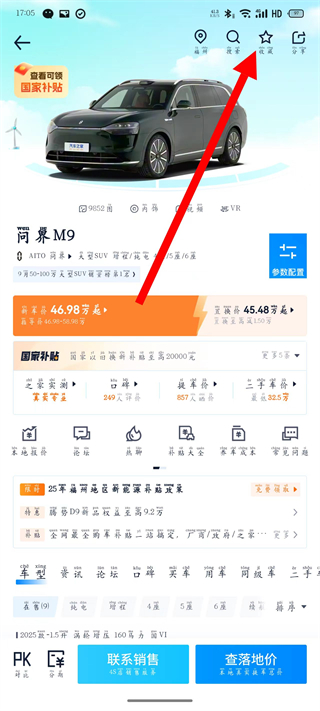 4、在车型详情页,点击右上角收藏按钮,加入收藏夹以便后续查看。