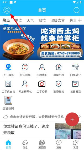 1、在掌上湘西app首页点击左上角个人图标,进入我的页面。