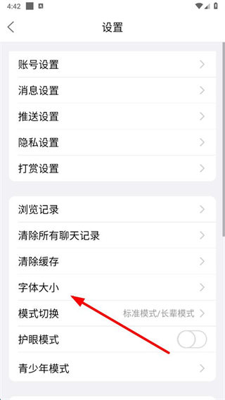3、在设置页面点击字体大小选项,进入字体大小设置页面。