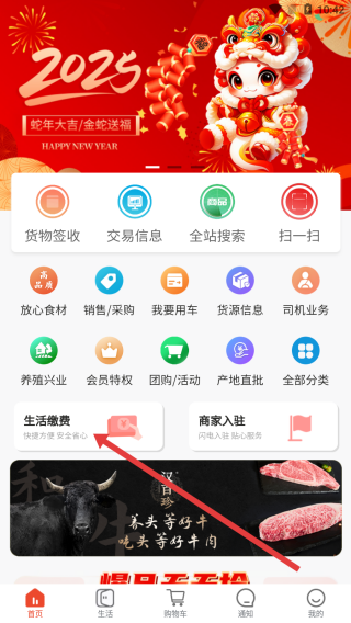 1、首先打开应用进入首页,找到并点击生活缴费板块,即可开启生活费用缴纳相关流程。