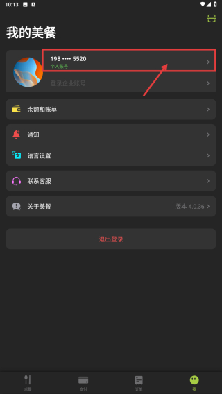 2、在我的美餐页面,点击账号区域,进入个人账号信息页面。