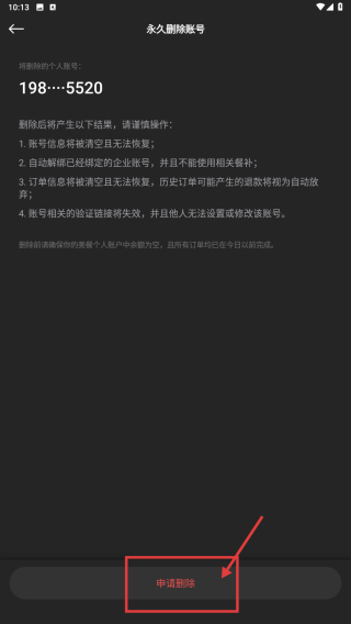 4、在永久删除账号页面,点击申请删除按钮,提交账号删除申请。