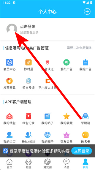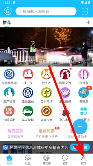 1、打开平度信息港,点击底部导航栏的我的,进入个人中心页面。
