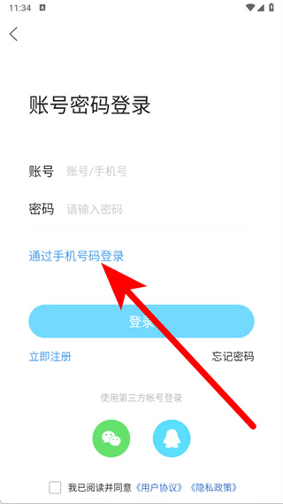 3、在登录界面,点击通过手机号码登录,进入手机号登录页面。