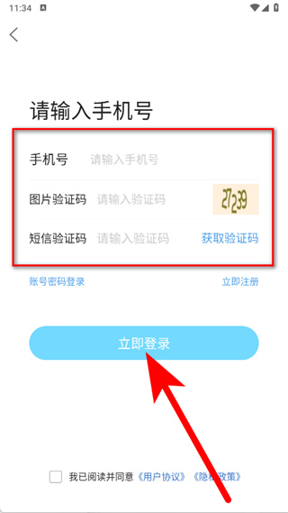 4、依次输入手机号,点击获取验证码并输入短信验证码,勾选后,点击立即登录按钮。