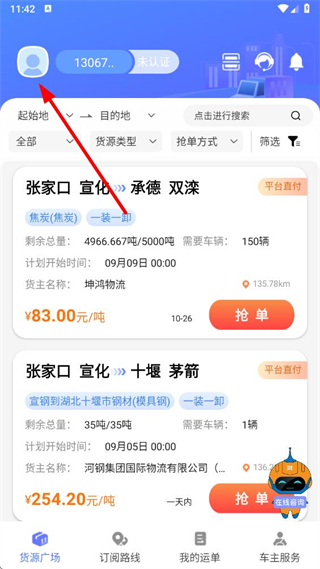 1、在铁铁智运app货源广场页面点击左上角个人图标,弹出功能菜单。