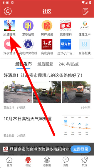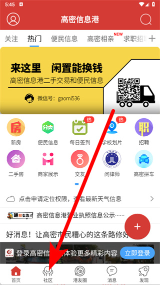 1、打开高密信息港,点击底部导航栏社区,进入社区页面。