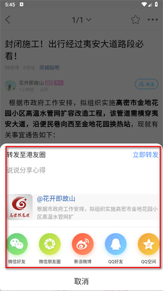 5、在分享选项中选择分享渠道,完成帖子分享操作。