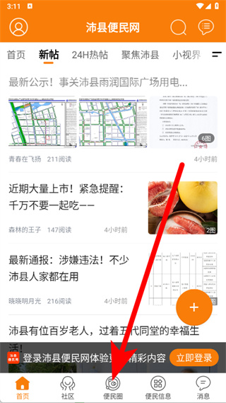 1、打开沛县便民网,点击底部导航栏便民圈,进入便民圈页面。