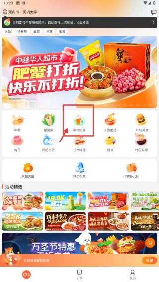 1、打开美食外卖类应用,点击咖啡奶茶分类选项,进入咖啡奶茶商家列表页面。