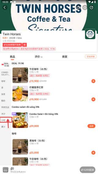 2、在商家列表页面,点击Twin-Horses商家条目,进入商家商品页面。