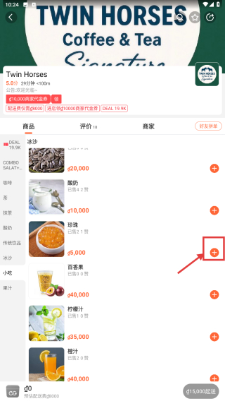 3、在商家商品页面,找到目标商品如百香果条目,点击其右侧的+按钮。