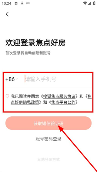3、在登录页面,输入手机号,点击获取短信验证码。