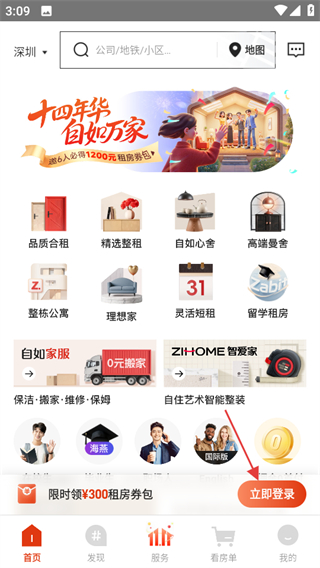 1、打开自如租房,在首页点击立即登录,可进入登录页面。