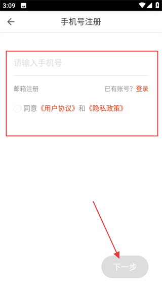 2、在登录页面,点击注册可进入手机号注册页面。