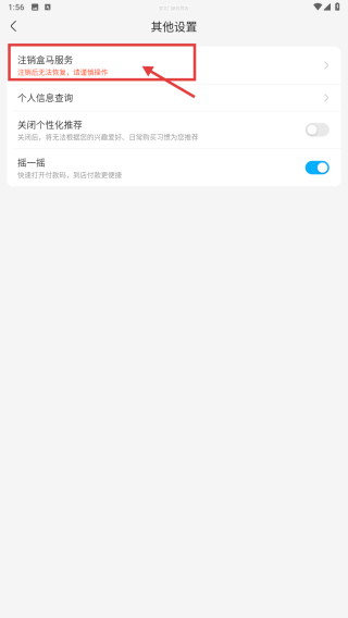 4、在其他设置页面,点击注销盒马服务选项,发起账号注销操作。