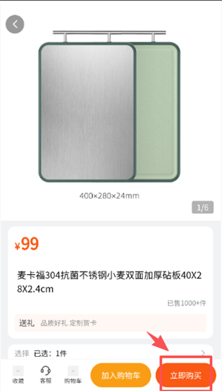 3、在厨卫商品列表页面,找到麦卡福304抗菌不锈钢小麦双面加厚砧板商品条目,点击进入商品详情页。