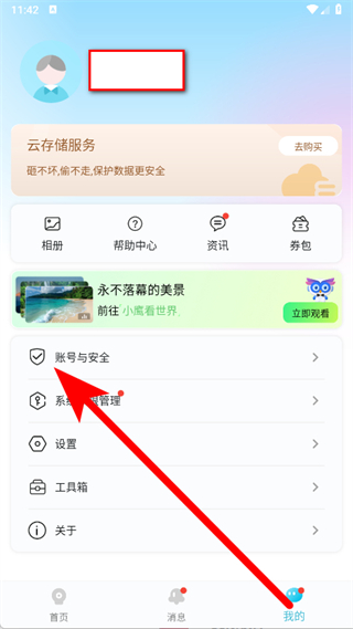 2、在个人中心页面,点击账号与安全,进入账号与安全页面。