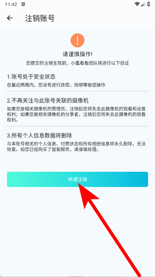 4、在注销账号页面,点击申请注销按钮,完成账号注销操作。