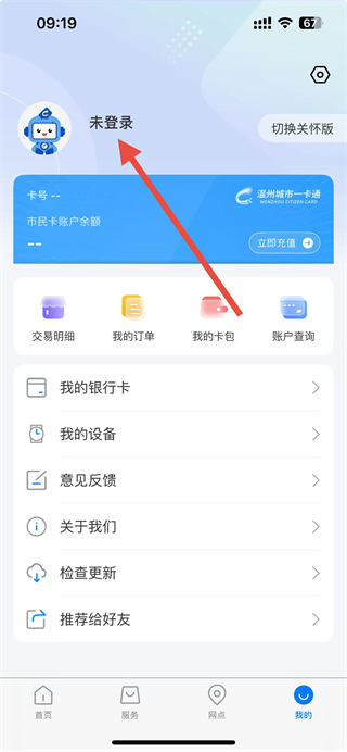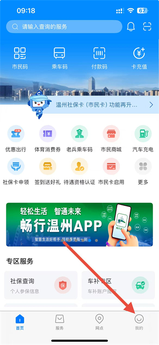 1、在温州市民卡app首页点击我的选项,进入个人页面。