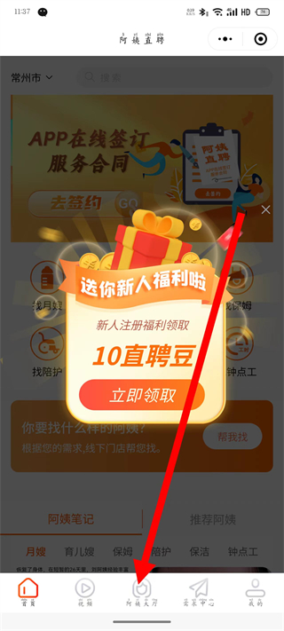 1、打开阿姨直聘,点击底部导航栏的阿姨大厅,进入阿姨列表页面。
