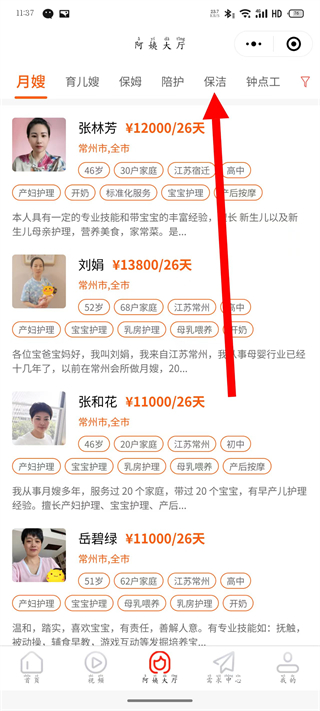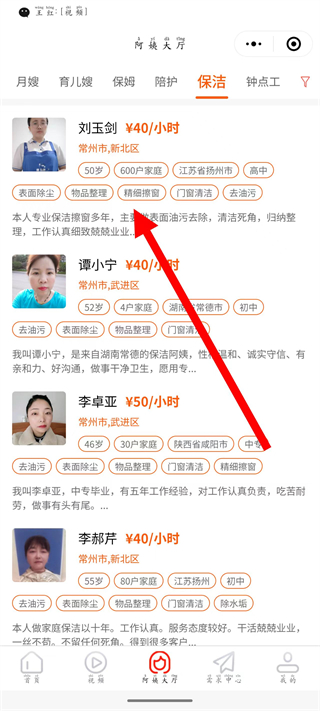 2、在阿姨列表页面,选择保洁分类,进入保洁阿姨列表。