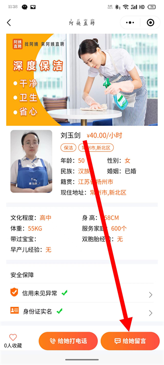 4、在阿姨详情页,点击给她留言按钮,沟通保洁服务相关事宜。