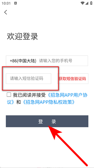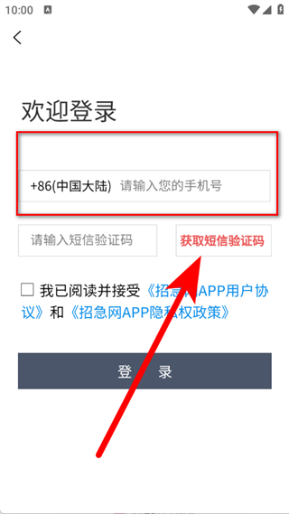 3、在登录页面,输入手机号,点击获取短信验证码。