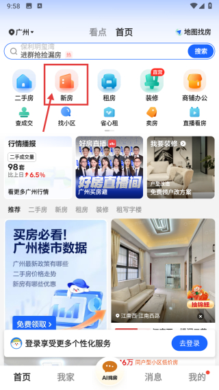 1、打开房产APP首页,点击新房选项,进入贝壳新房板块页面。