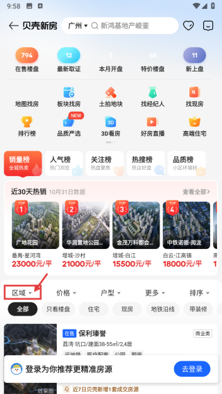 2、在贝壳新房页面,点击区域选项,进入区域筛选界面。