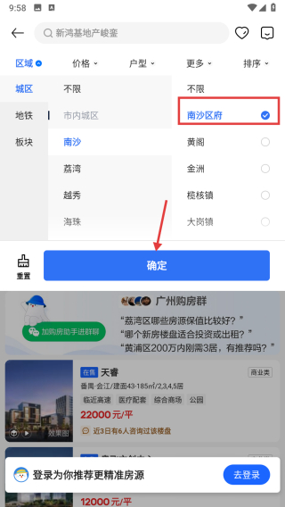 3、在区域筛选界面,选择南沙区府区域,点击确定按钮完成区域筛选。