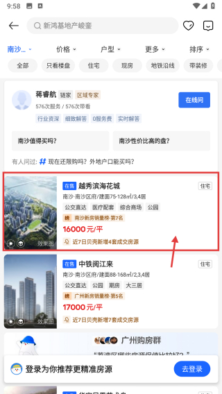 4、在筛选后的房源列表中,点击越秀滨海花城房源条目,进入房源详情页。