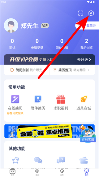 2、在个人中心页面右上角,点击设置图标,进入设置界面。