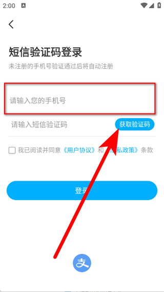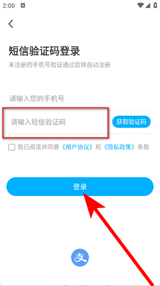 4、输入短信验证码,勾选用户协议后,点击登录,完成账号登录。