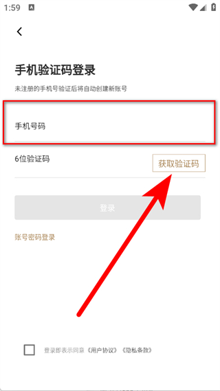 3、在注册登录页面,输入手机号码,点击获取验证码。