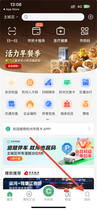 1、打开杭州市民卡APP,点击右下角我的进入个人页面。