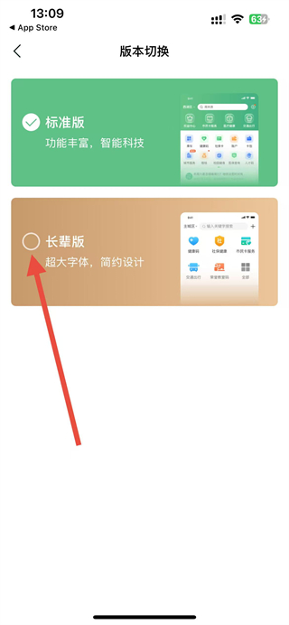 4、在版本切换页面,选择长辈版选项即可切换为长辈使用版本。