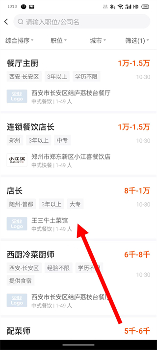2、在餐饮岗位列表,选择目标岗位,点击进入岗位详情页。