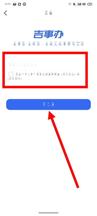 3、填写注册信息,勾选吉事办相关用户协议后,点击下一步。