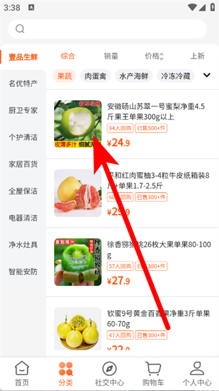 2、在分类页面,选择果蔬分类,进入果蔬商品列表,选择目标商品。