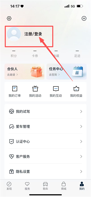 2、在个人页面,点击注册/登录,进入登录方式选择页面。
