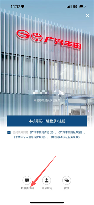 3、在登录方式选择页面,点击短信验证码,进入手机号输入页面。