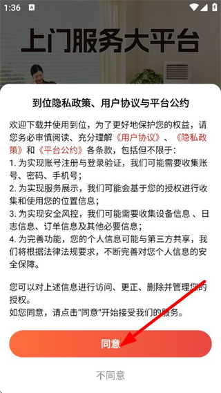 1、在隐私政策、用户协议弹窗,点击同意,进入登录页面。
