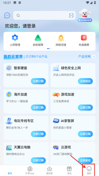 1、打开电信云宽带APP首页,点击底部我的选项,进入个人中心页面。