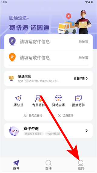 1、打开圆通速递APP,点击右下角我的,进入个人页面。