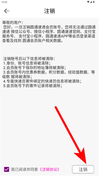 4、在注销说明页面,勾选同意注销协议后点击注销,完成账号注销。